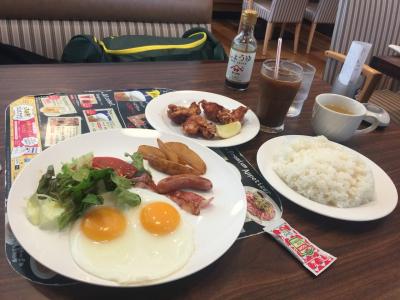 食べたのは目玉焼きモーニングセットに鶏唐揚げを付けて、、、ライスは大盛サービスで朝からガッツリですね(^ ^)