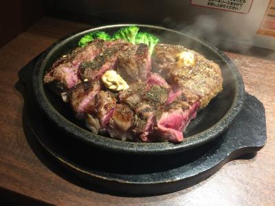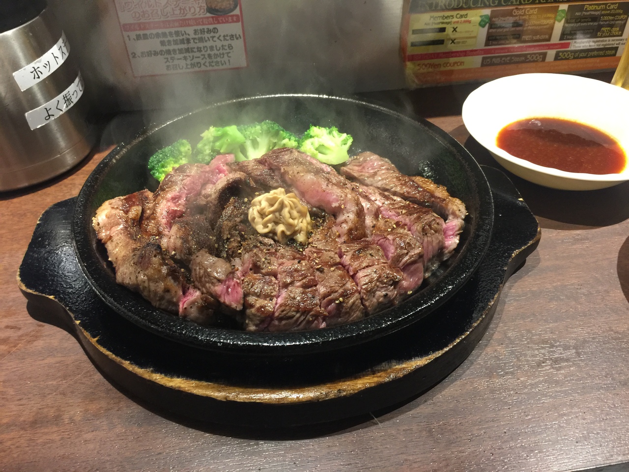 食べたのはワイルドステーキ450g!ステーキソースとわさびをかなり入れたわさび醤油で味を変えていただきます。