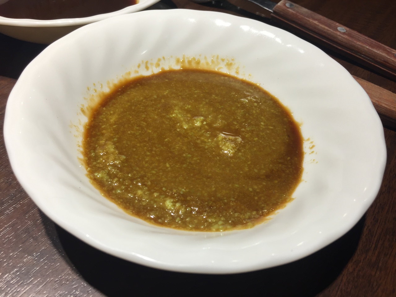 ワイルドステーキ450gにハーフバーグ150gを付けた600gをたいらげました。わさびをガッツリ入れたわさび醤油とステーキソースで味を変えて!