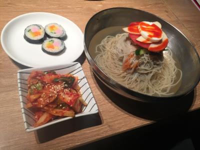 だいぶ気候も暖かくなってきたので韓国冷麺980円をたのみました。プラス100円で大盛にしましたよ。おかずとサラダはおかわり自由!おかずにキムチがあったのでそれだけおかわりして冷麺に入れて食べました!美味い(^ ^)- 旅行時期