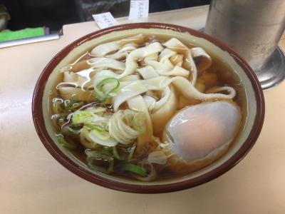 食べたのは納豆朝食!ご飯に納豆と生卵、小うどんとかき揚げ天ぷらで350円です。小うどんを普通サイズに100円でしてもらいました。ナイスバランスです(^ ^)- 旅行時期