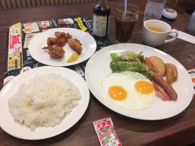 食べたのは目玉焼きモーニングセットに鶏唐揚げを付けて、、、ライスは大盛で、、、大盛は無料ですからね。朝からガッツリでした(^ ^)- 旅行時期
