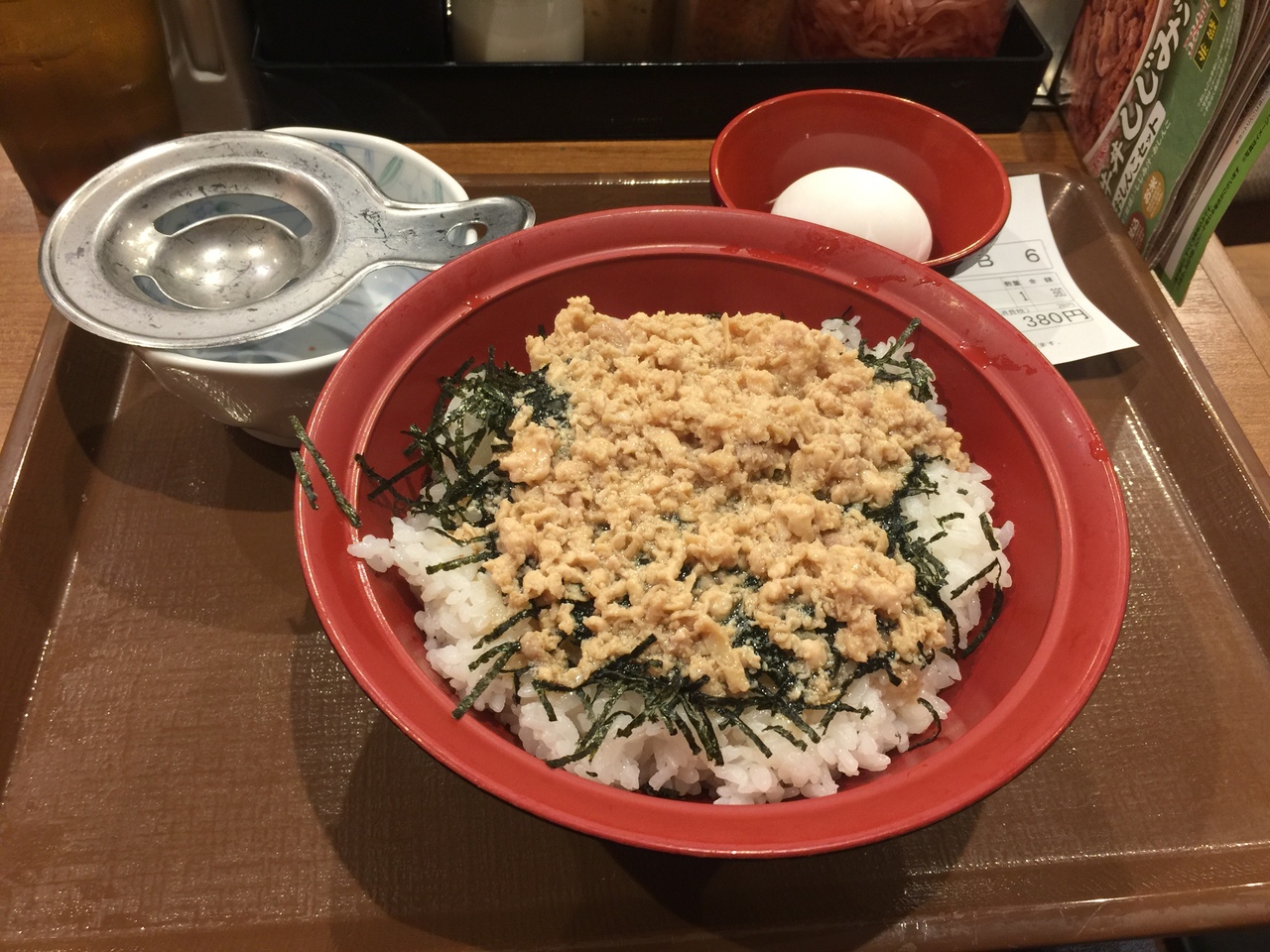 食べたのは鶏そぼろ丼大盛!生卵の黄身と白身を別ける道具がついてたが白身ももったいないからそのまま投入!美味しいですよ。- 旅行時期