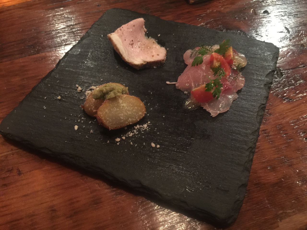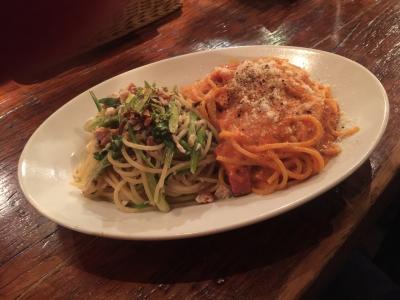 飲み物と前菜とパスタです。パスタはメカジキと山形山菜のアーリオオーリオとトマトカルボナーラのダブルでグランデにしてもらいました。美味しいですよ(^ ^)- 旅行時期
