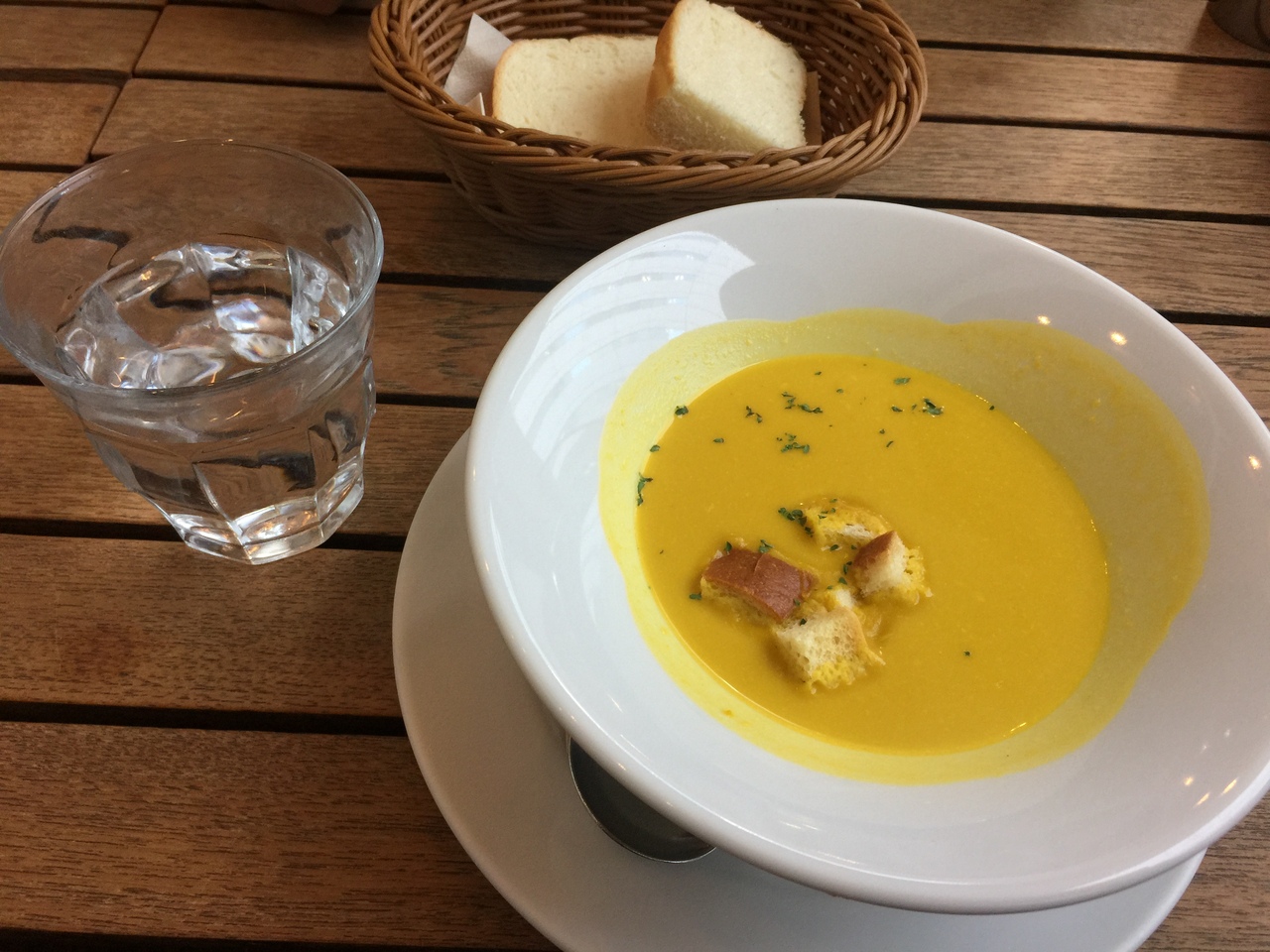 サラダかスープを選べて、、、あとは飲み物!スープにしました。カボチャのスープ、、、あとはアイスコーヒー!