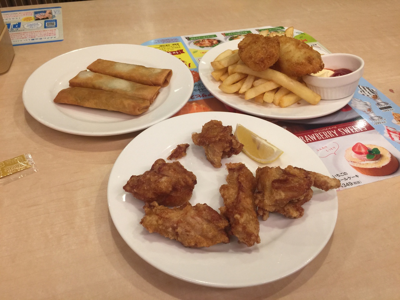鶏唐揚げ、春巻、フィッシュ&チップス!赤ワインはデカンタで、、、