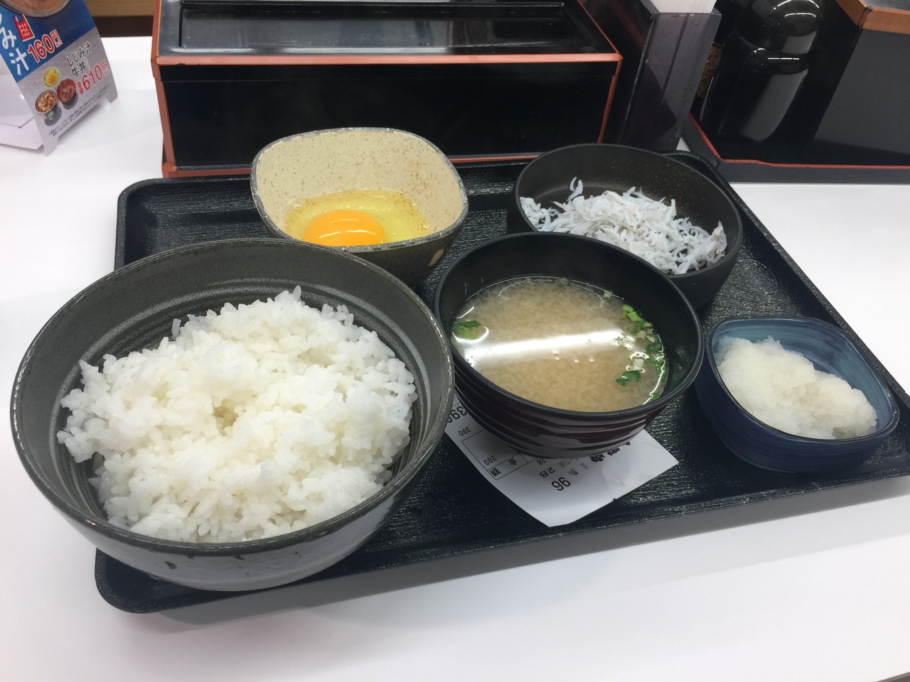ご飯に釜揚げしらす、大根おろし、生卵、味噌汁!