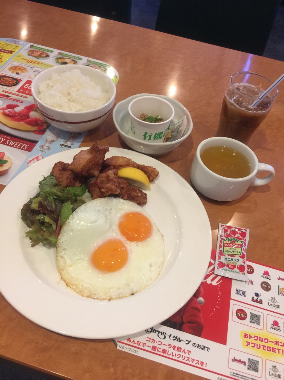食べたのは目玉焼きセットに鶏唐揚げと納豆を追加で。。。