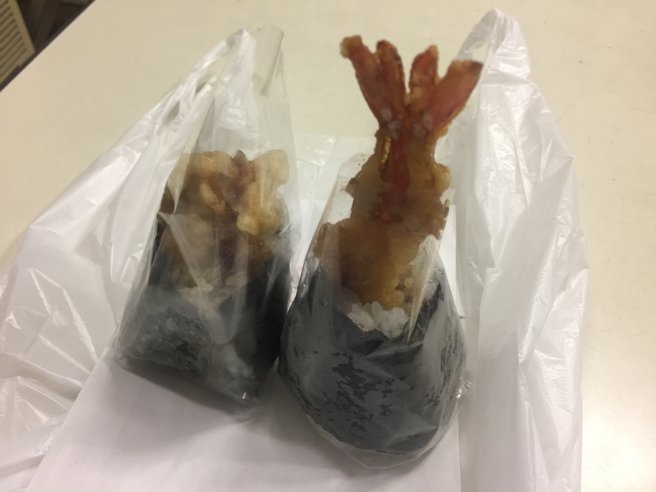 天むすは海老天むす、いか天むす、舞茸天むすの3種がありました。3つは多いな。。。まよった!!!