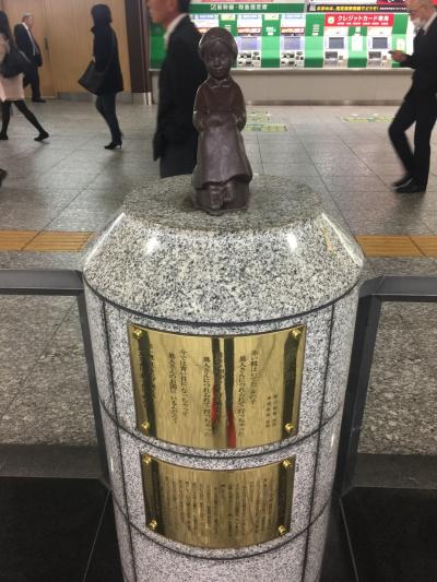 平日の通勤ラッシュで人が行き交う中の赤い靴はいてた女の子像です。待ち合わせに使ってる方はいなかったのでアップで撮影!歌詞も刻まれてるんですね!