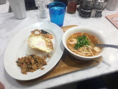 ハーフガパオは鶏、豚、野菜から鶏を!ハーフヌードルはトムヤムヌードルを選びました。