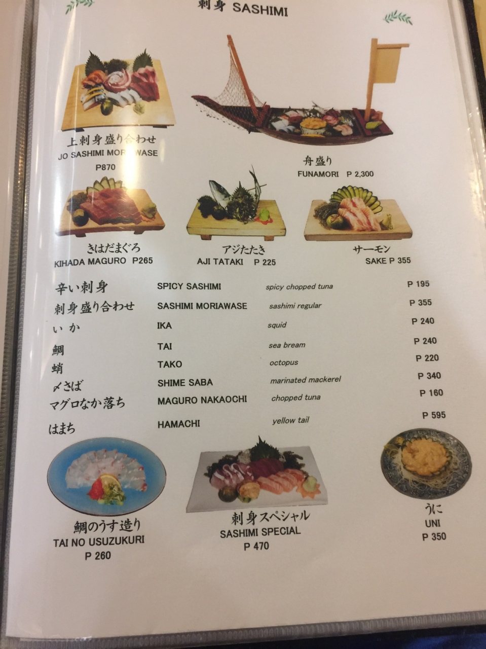 焼きそば、カリフォルニアロール、すき焼き(小)、刺身スペシャル、うに刺身、、、サンミゲル1本と眞露360ml2本にカラマンシーや氷で2469.5ペソでした。現地の友人と2人分です。- 旅行時期
