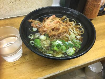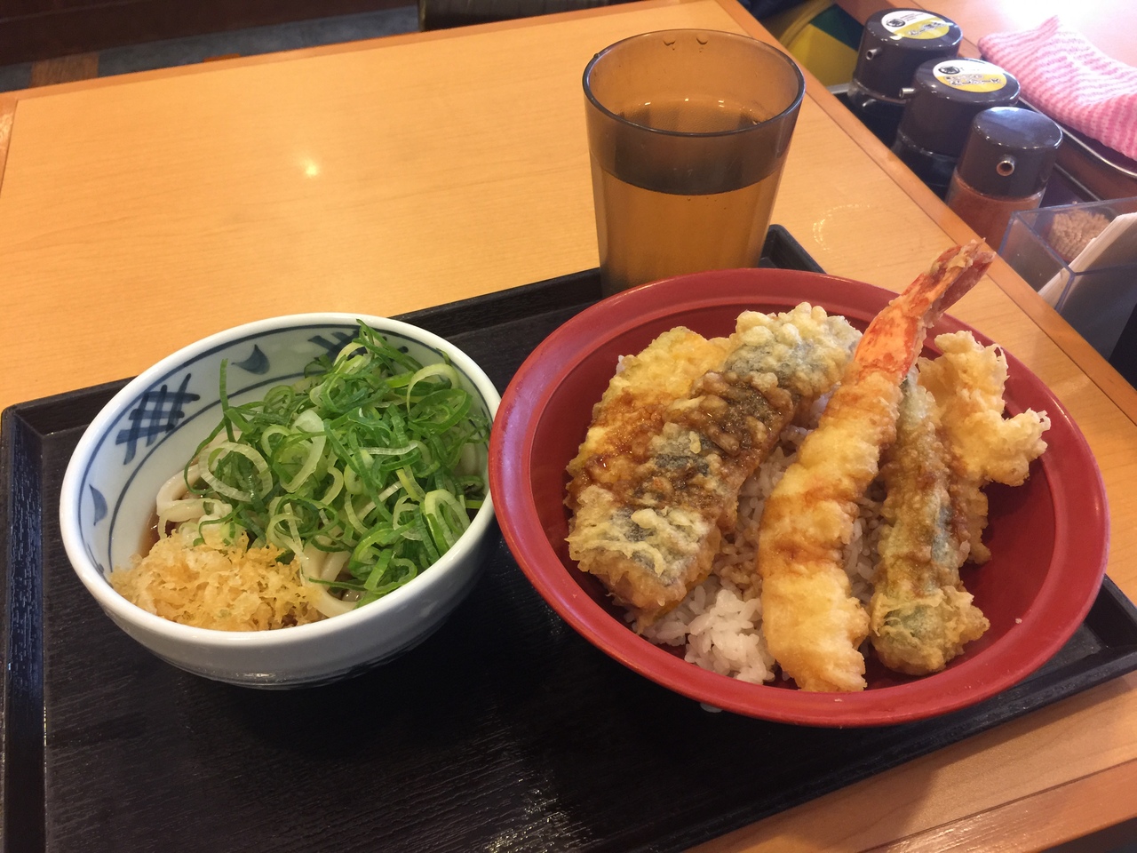 天丼には海老天、イカ天、ナス天、カボチャ天、オクラ天がのってます。セットの小うどんは冷たいのにしました。ネギと天かすはかけ放題!- 旅行時期