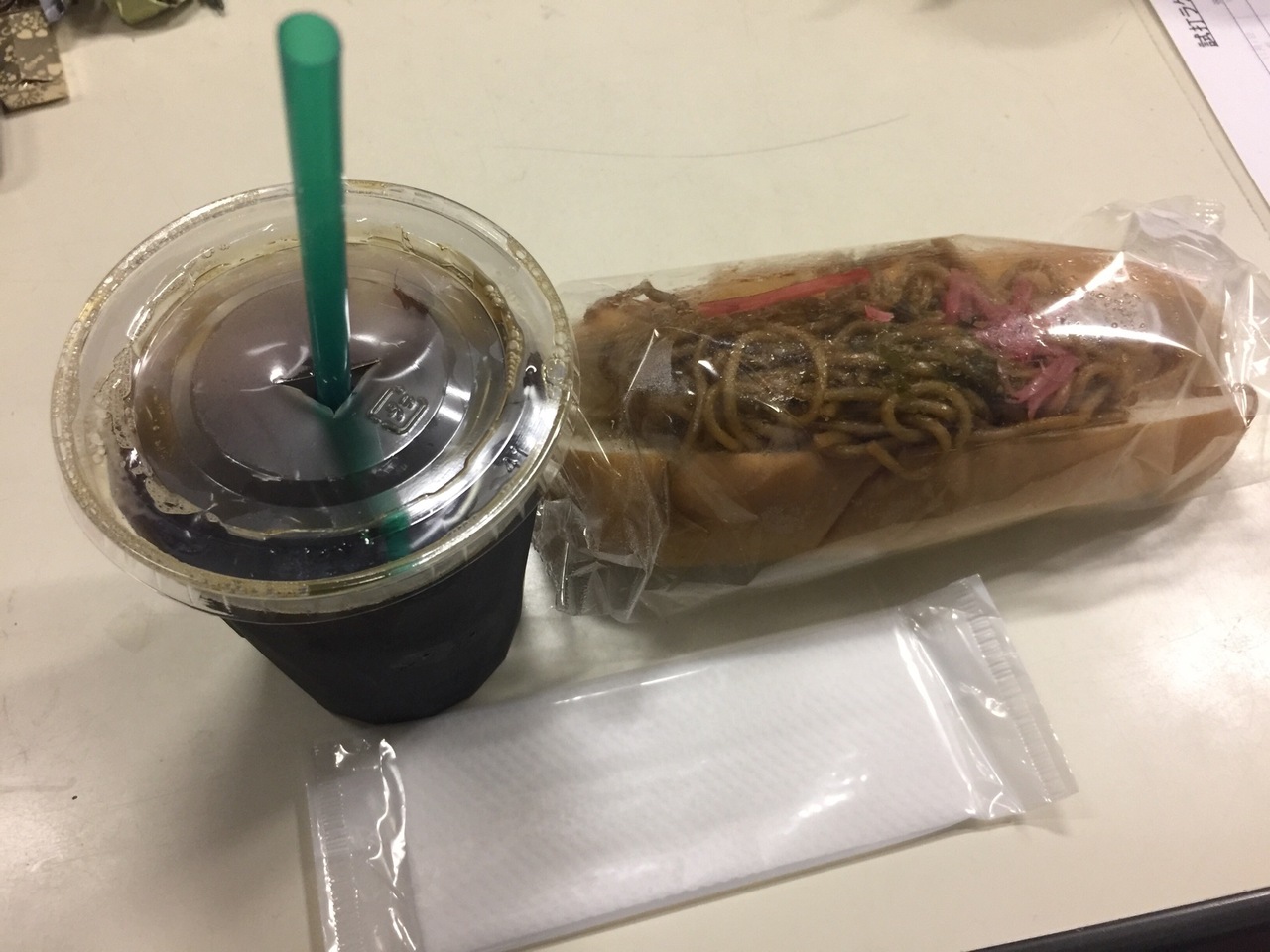 買ったのはジャンボ焼きそばロール200円とアイスコーヒー250円!食べるときにシロップとミルクが無かった~(T ^ T)- 旅行時期