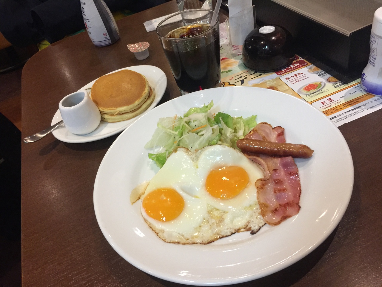 たのんだのはセレクトモーニング592円!サニーサイドアップにパンケーキ、アイスコーヒーを選びました。