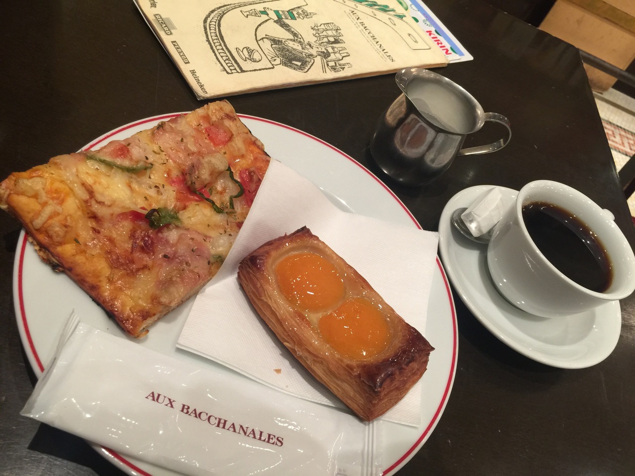 パンアラピッツァ262円とダノワーズアプリコット230円を買い店内でカフェ500円をたのみいただきました。