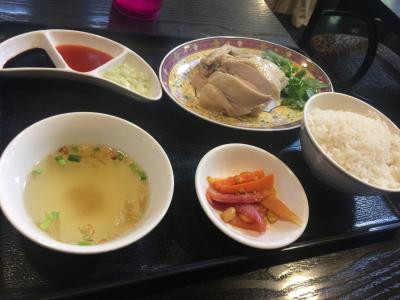たのんだのは海南チキンライス1,250円!たまり醤油、チリ、タマネギと3種のタレにチキンをつけて、、、美味しいですね(^ ^)- 旅行時期