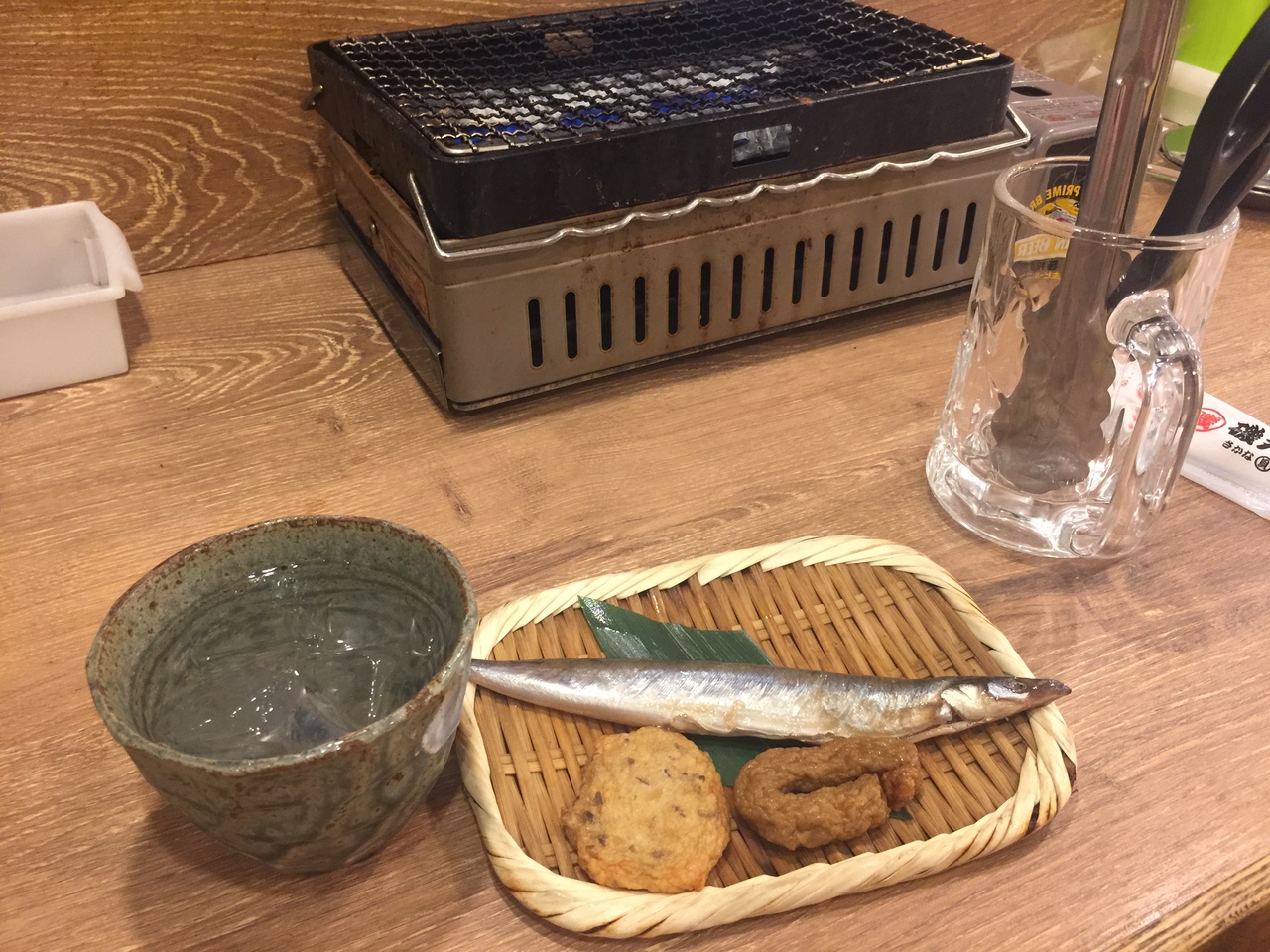薩摩白波はランチドリンクで税込270円!お通しはじゃこ天等ときびなご、、、自分で焼いて食べます。