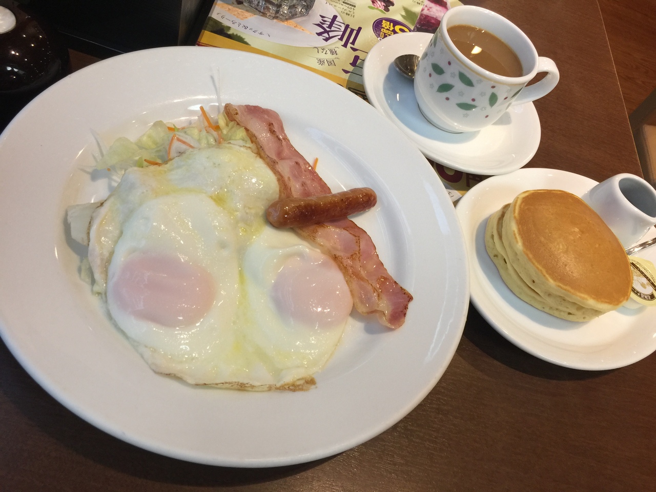 ベースドエッグにパンケーキ、ホットコーヒーで税込592円!