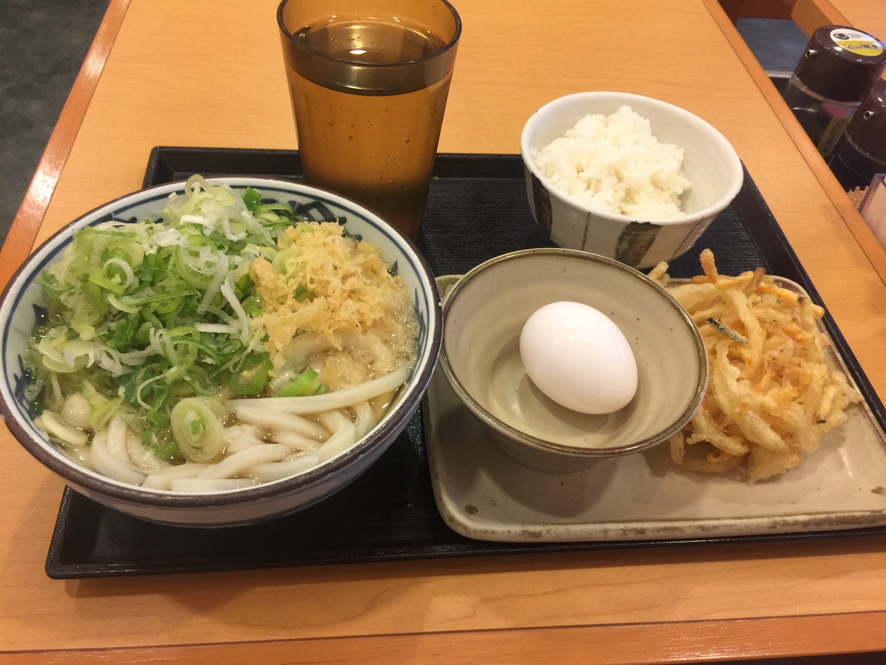 食べたのは朝メニューの卵かけご飯朝食!通常は小うどんにかき揚げ天ぷら、ご飯、生卵。小うどんを普通サイズにして400円!ネギと天かすはかけ放題だからドバッと(^ ^)- 旅行時期