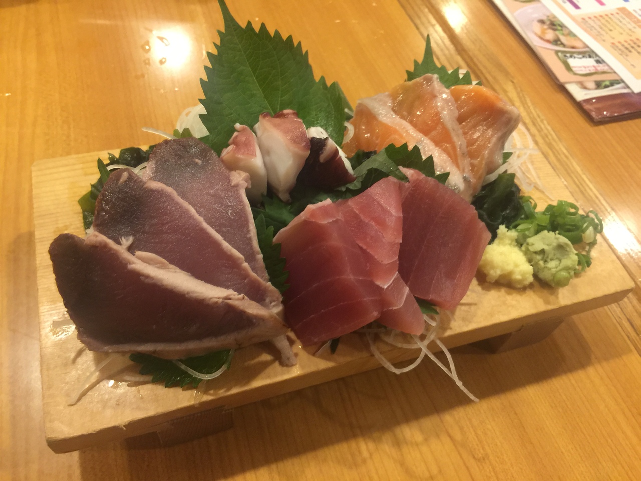 ツマミは刺身の盛り合わせ!カツオ、サーモン、マグロ、タコ!秋刀魚の塩焼き!