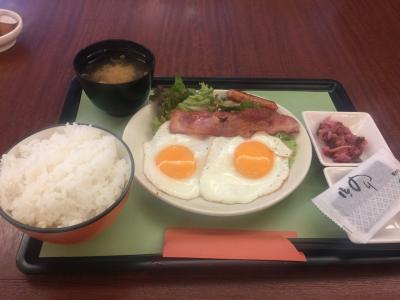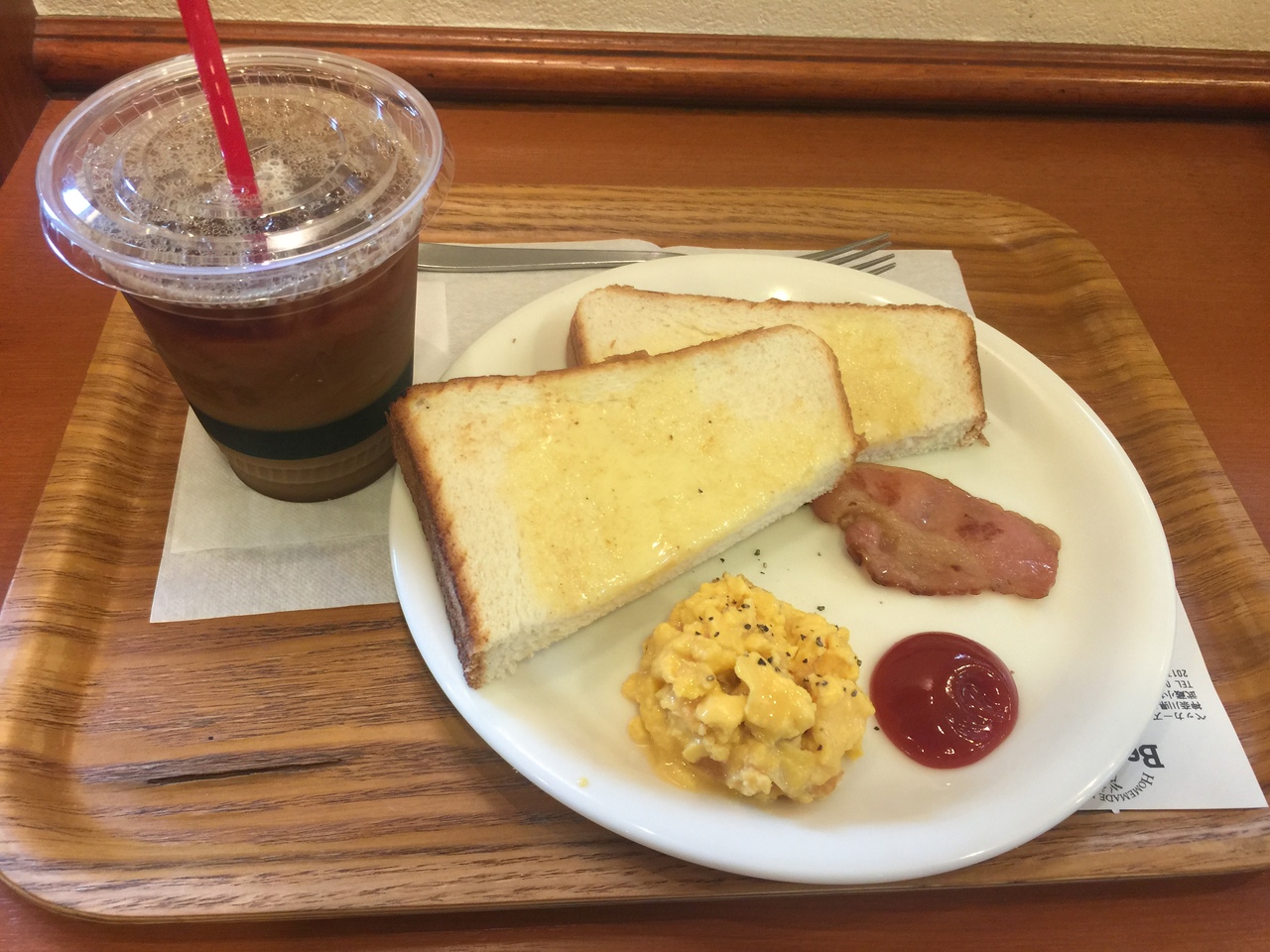 トーストに小さなベーコンにスクランブルエッグ、飲み物はアイスコーヒーにしました。- 旅行時期