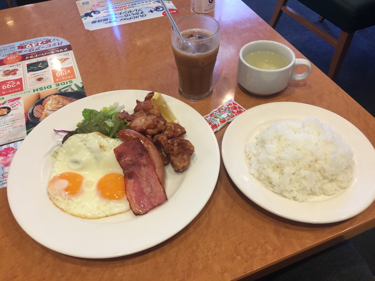 食べたのは目玉焼きベーコンソーセージセットに鶏唐揚げ!本当は目玉焼きセットをたのんだんだけど間違えてました。鶏唐揚げを追加したからベーコンとソーセージはいらなかったんだけどね(>_<)