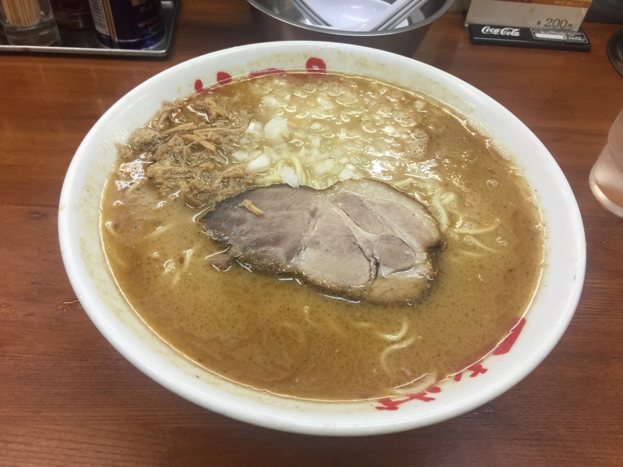 かなり色の濃いスープに濃い色の麺です。味はそこそこか!?