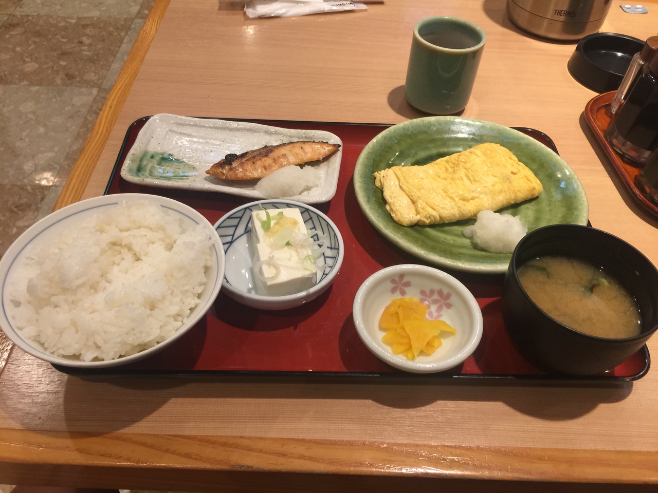 たのんだのは特朝定食!焼き魚にだし巻き玉子、冷奴、味噌汁、漬物、ご飯で550円です。焼き魚はイマイチかな。コスパはイマイチかな!?