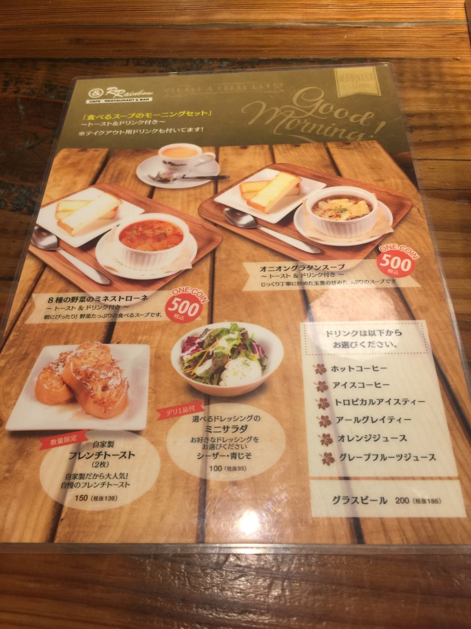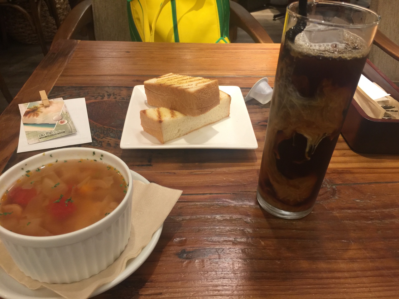 飲み物だけだと400円!モーニングのセットだと500円!ミネストローネとトーストのセットをたのんでしまった。食べ過ぎ~(>_<)- 旅行時期