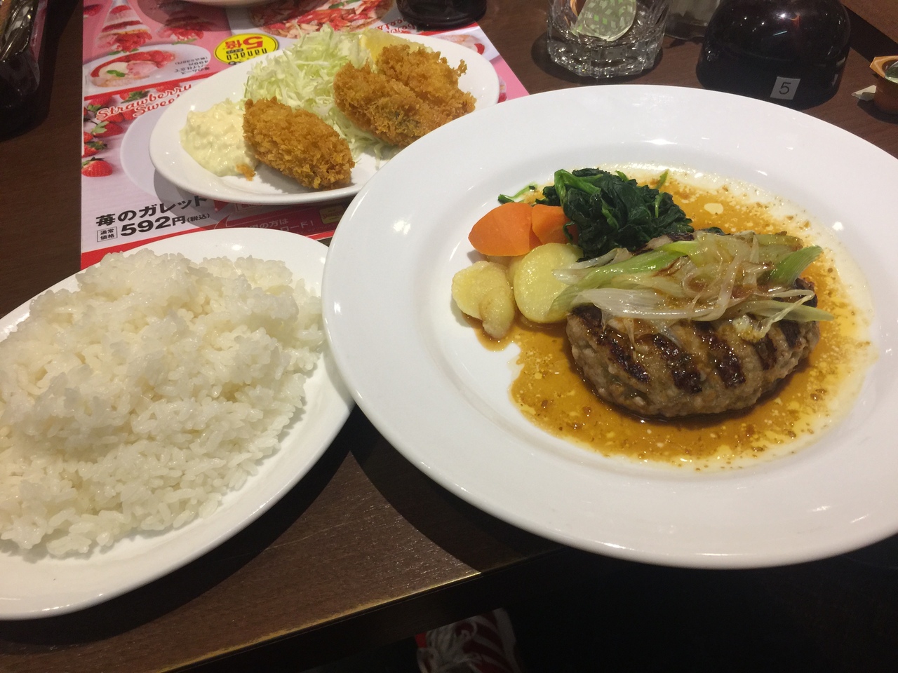 朝からガッツリ和風ハンバーグにカキフライ(^ ^)