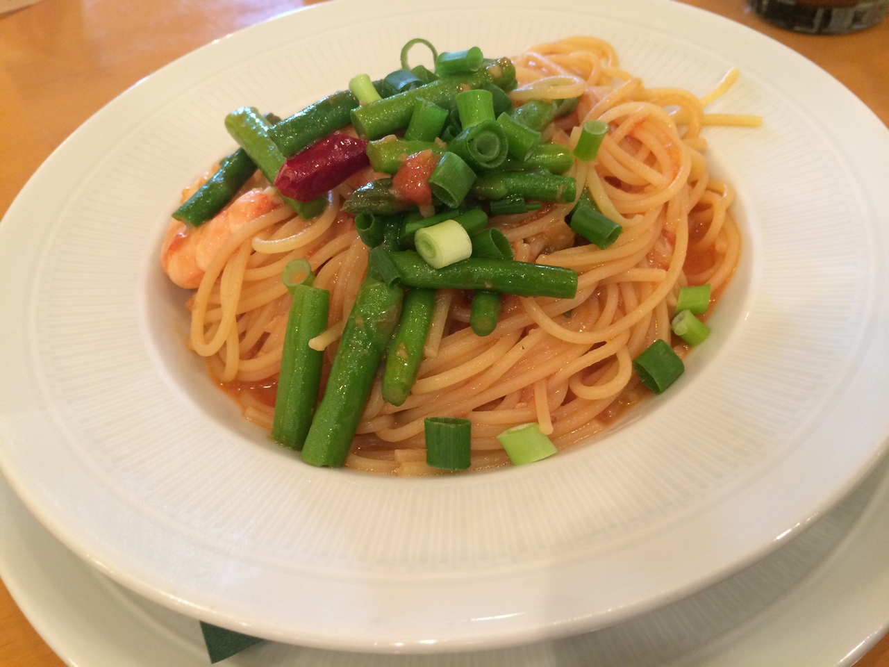 たのんだのは季節のパスタ!海老とアスパラガスのオマール海老ソーススパゲッティ1,030円!なかなか美味しいですよ(^ ^)