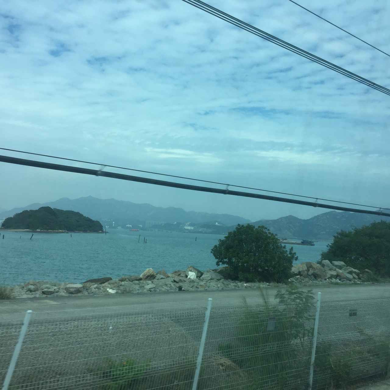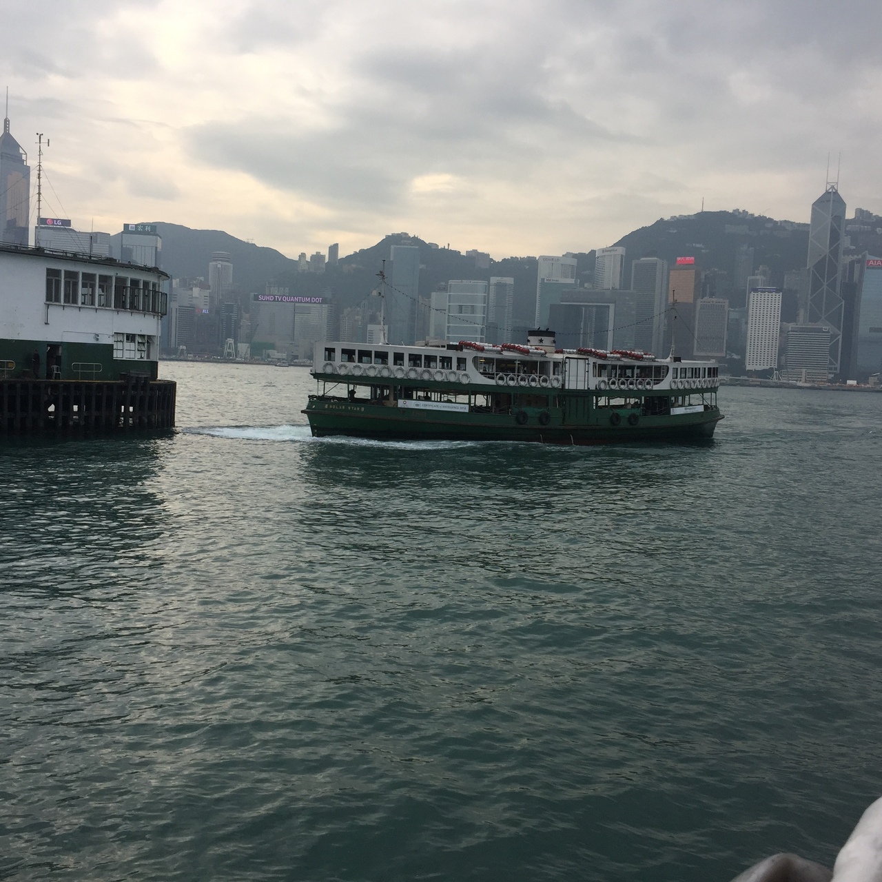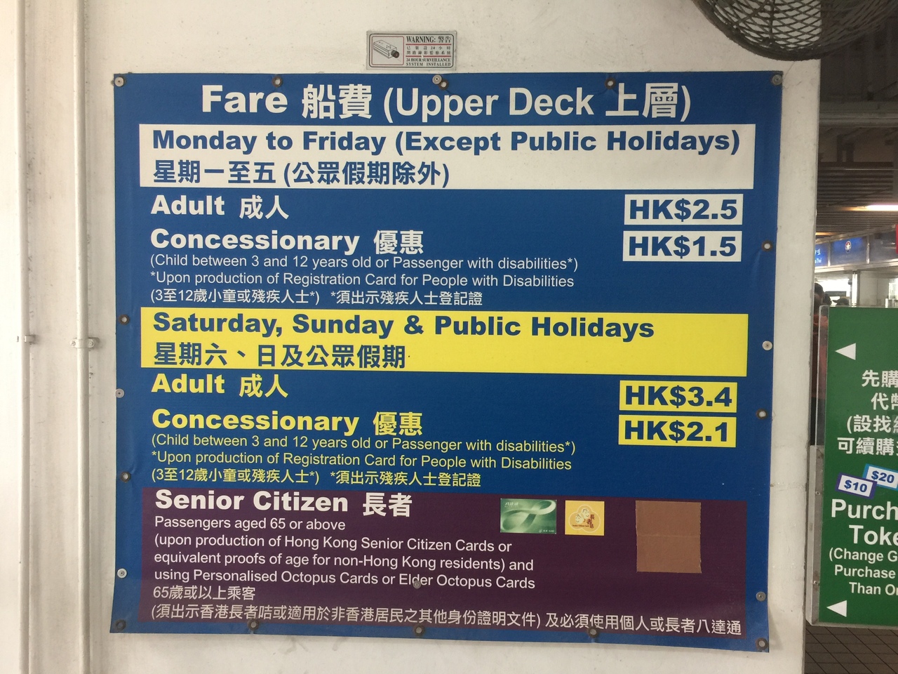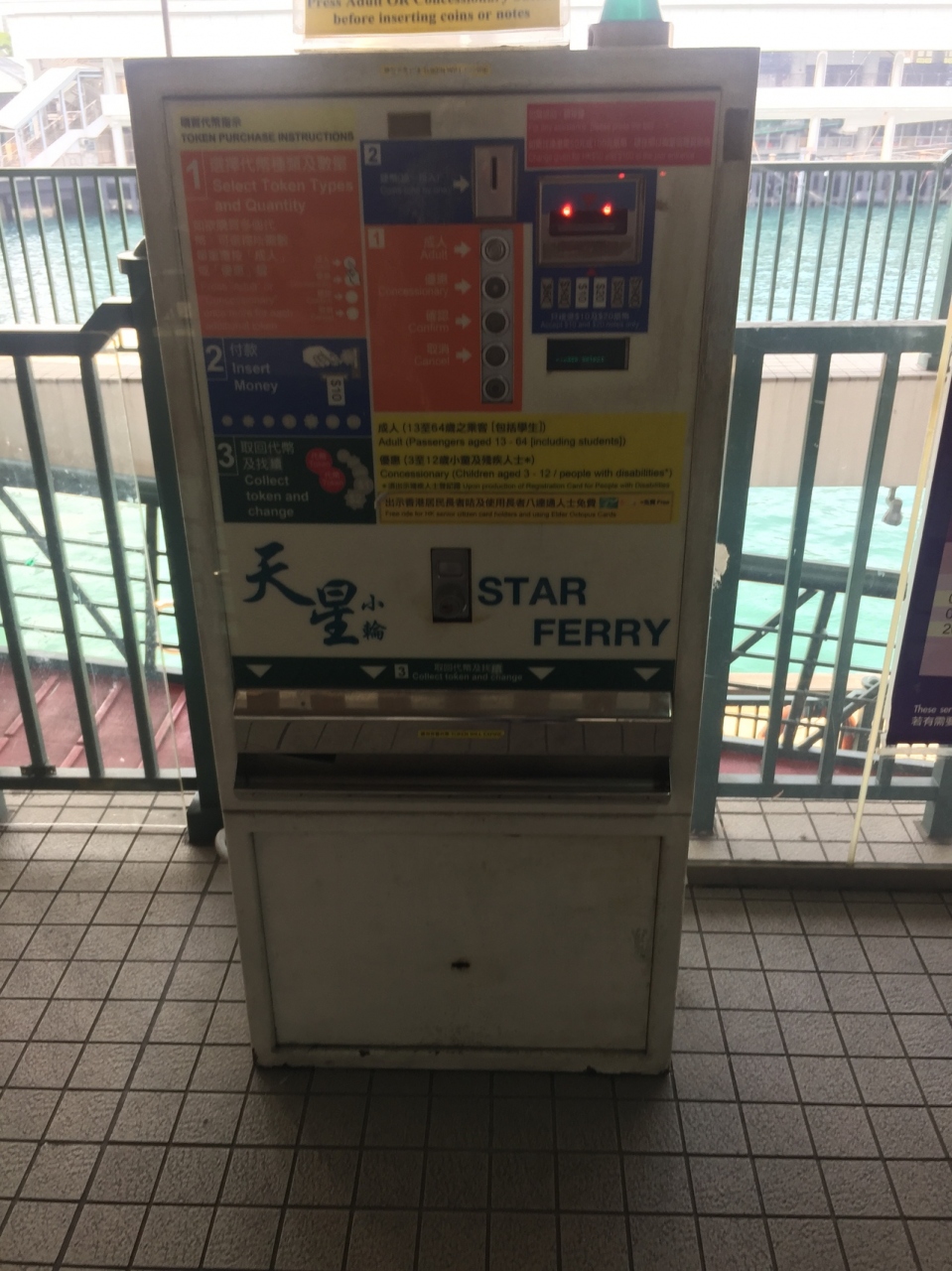 香港島のビル群を眺めながら中環に移動でします。チケットはトークンで自動券売機で購入します。