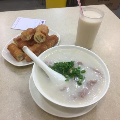 たのんだのはピータンと牛肉の粥と揚げパン、豆乳!美味しいです(^ ^)!豆乳は甘め!- 旅行時期