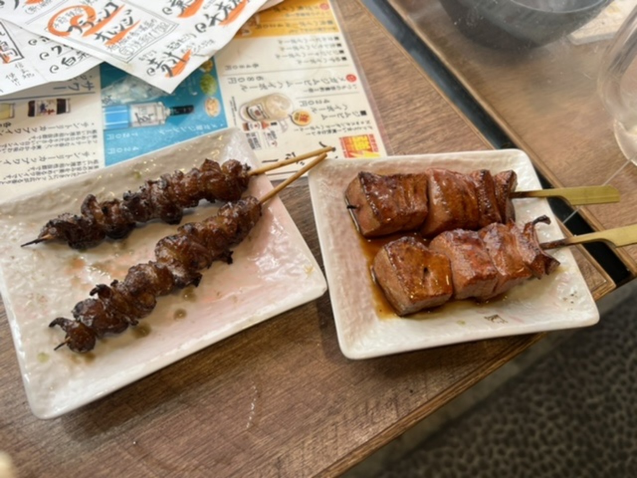 先ずは生ビール。もつ煮込みで。鶏皮串に白レバー串。
