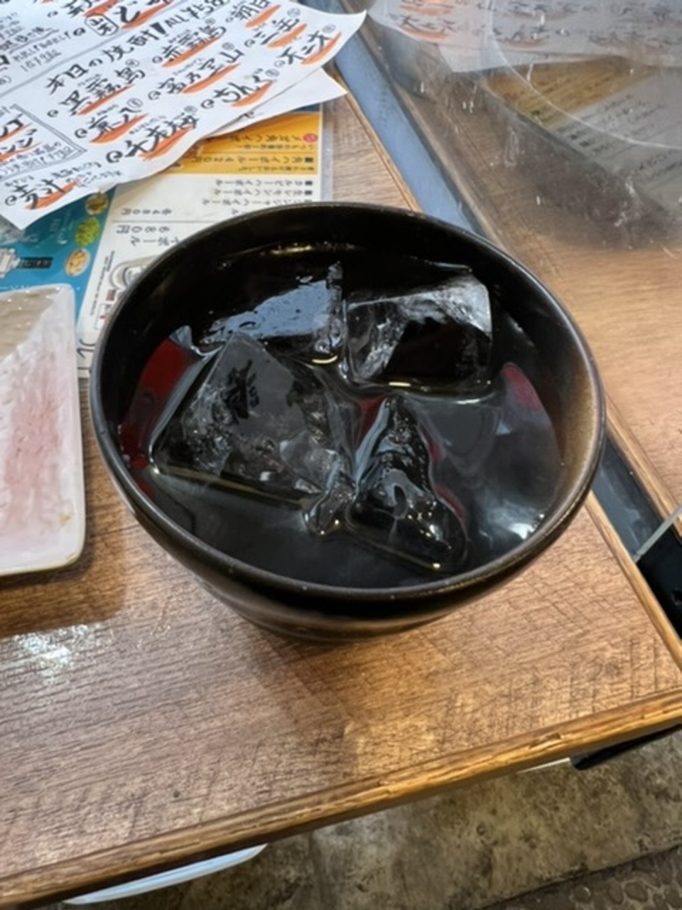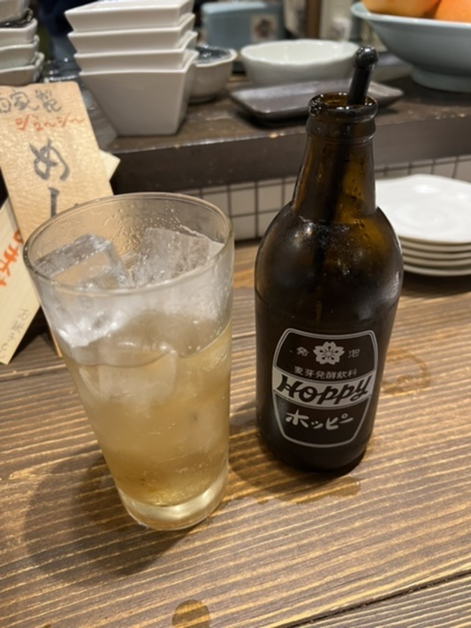 立ち飲みは飲み物半額なので立ち飲みで。ここはお通しがもつ煮込みで食べ放題です。