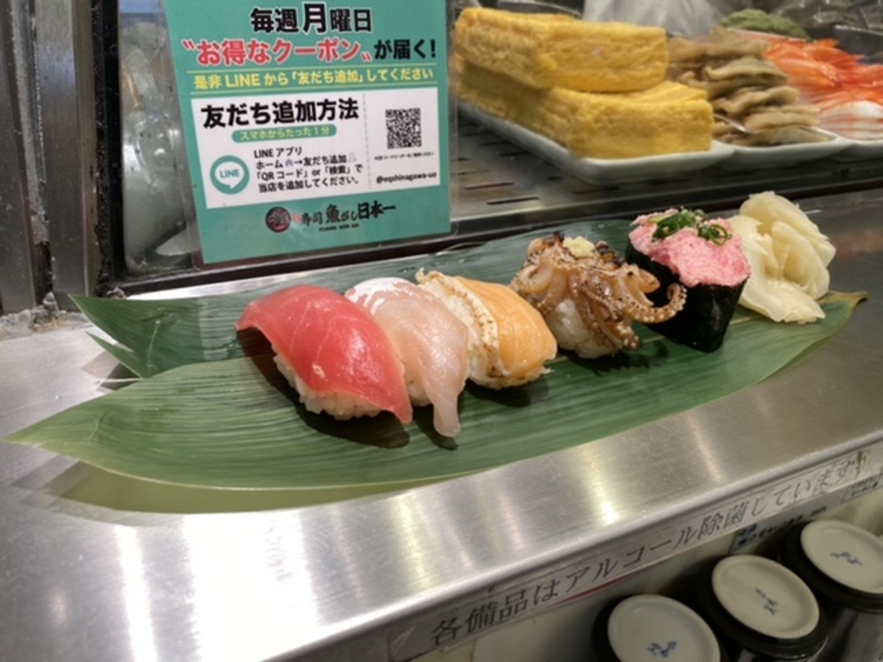 食べたのは5貫セット(まぐろ、さわら、ネギトロ、サーモン、焼きゲソ)、びんちょう2貫、まぐろ2貫の計9貫!990円でした。- 旅行時期