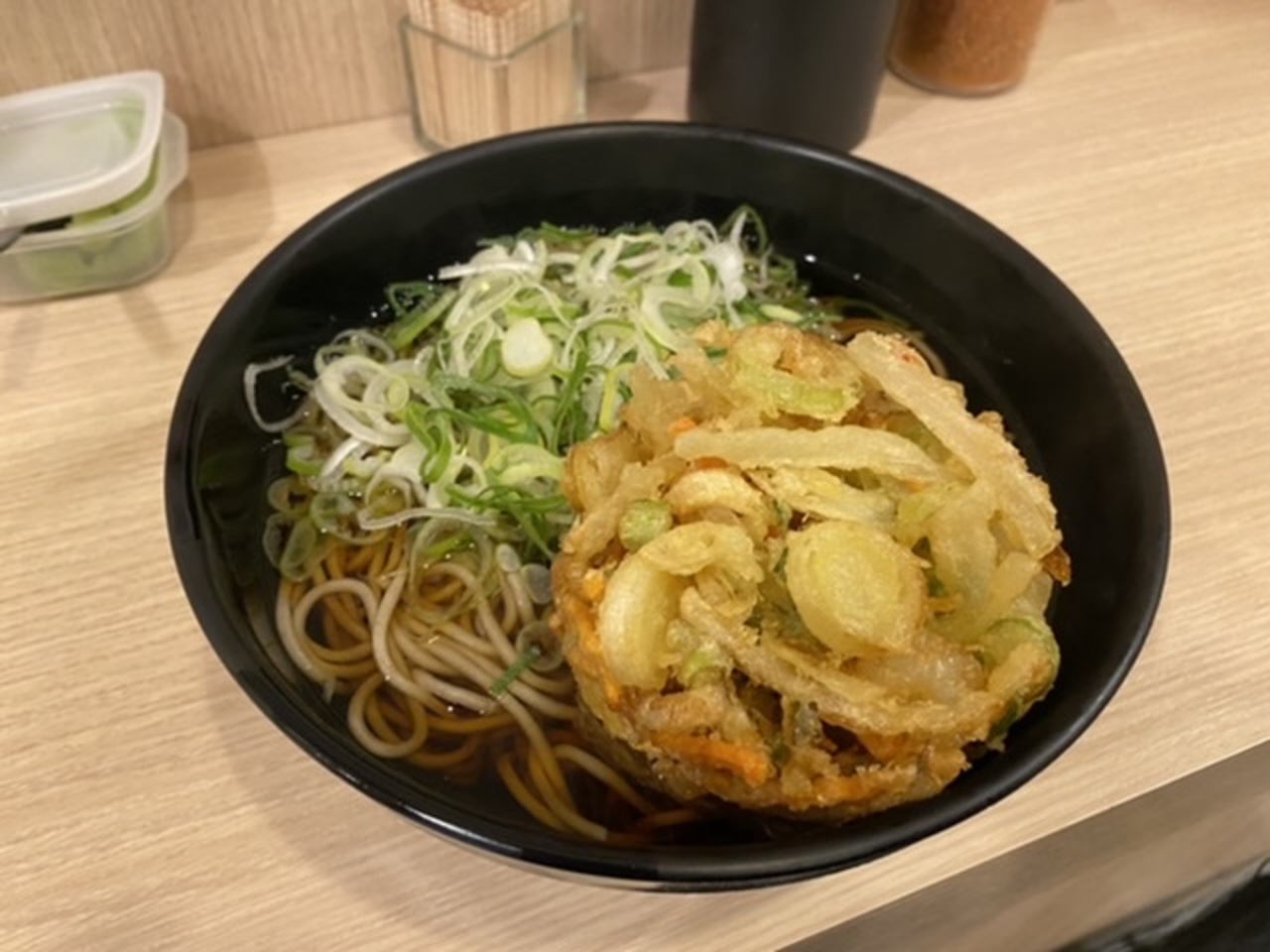 食べたのはかき揚げ蕎麦520円!大きなカリカリのかき揚げ天ぷらが入っています。崩して食べて美味しいです。- 旅行時期