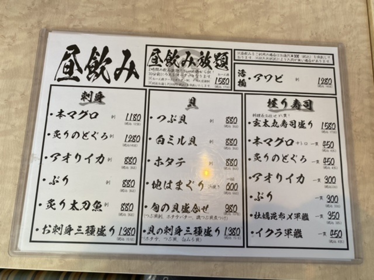 飲み放題1,580円で先ずは生ビール!玄太丸寿司盛りは鮪、鰤、イカ、金目鯛、しめ鯖、ホタテ、いくら、甘エビ。お刺身3種盛りは鰤、しめ鯖、イカに甘エビサービス。