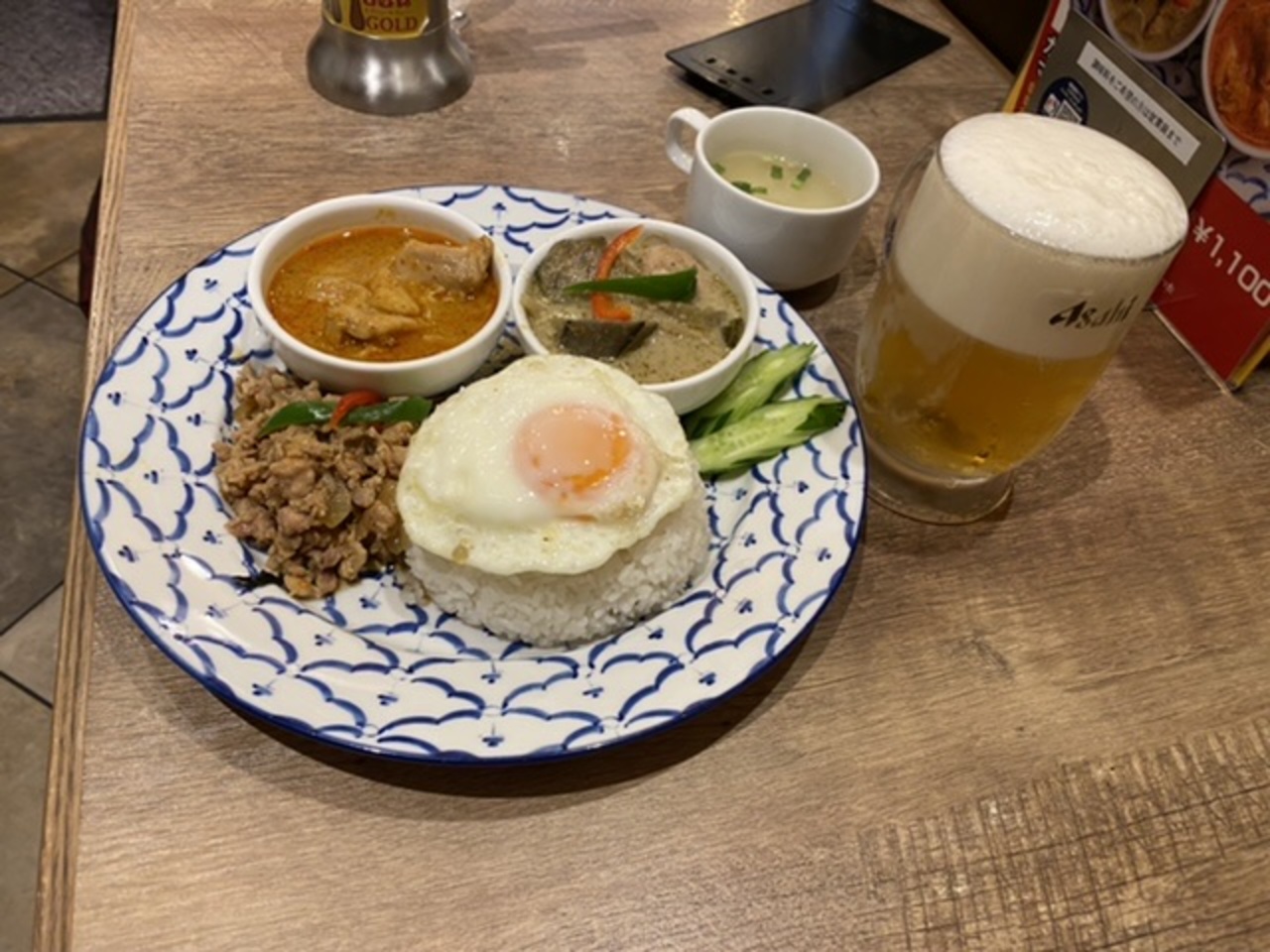 まずは生ビール!食べたのは週替わりおすすめセット1,100円。ガパオ&グリーンカレー&マッサマンカレーでした。いろいろ味わえて良かったです。- 旅行時期