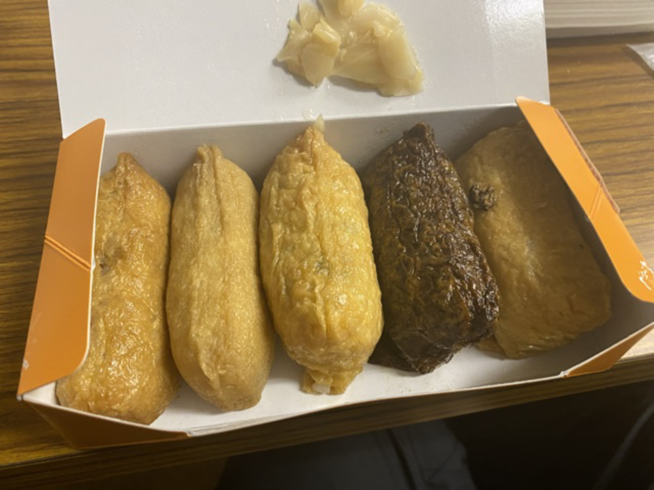 買ったのは品川人気5種690円!普通の稲荷寿司に五目、わさび、黒糖の油揚げ。ここの稲荷寿司は美味しいですよ。おすすめです。- 旅行時期