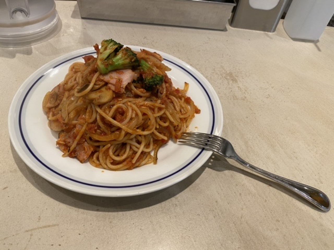 食べたのはアラビアータスパゲッティ910円!朝はサラダが付きますよ。味はまあまあかな!?- 旅行時期