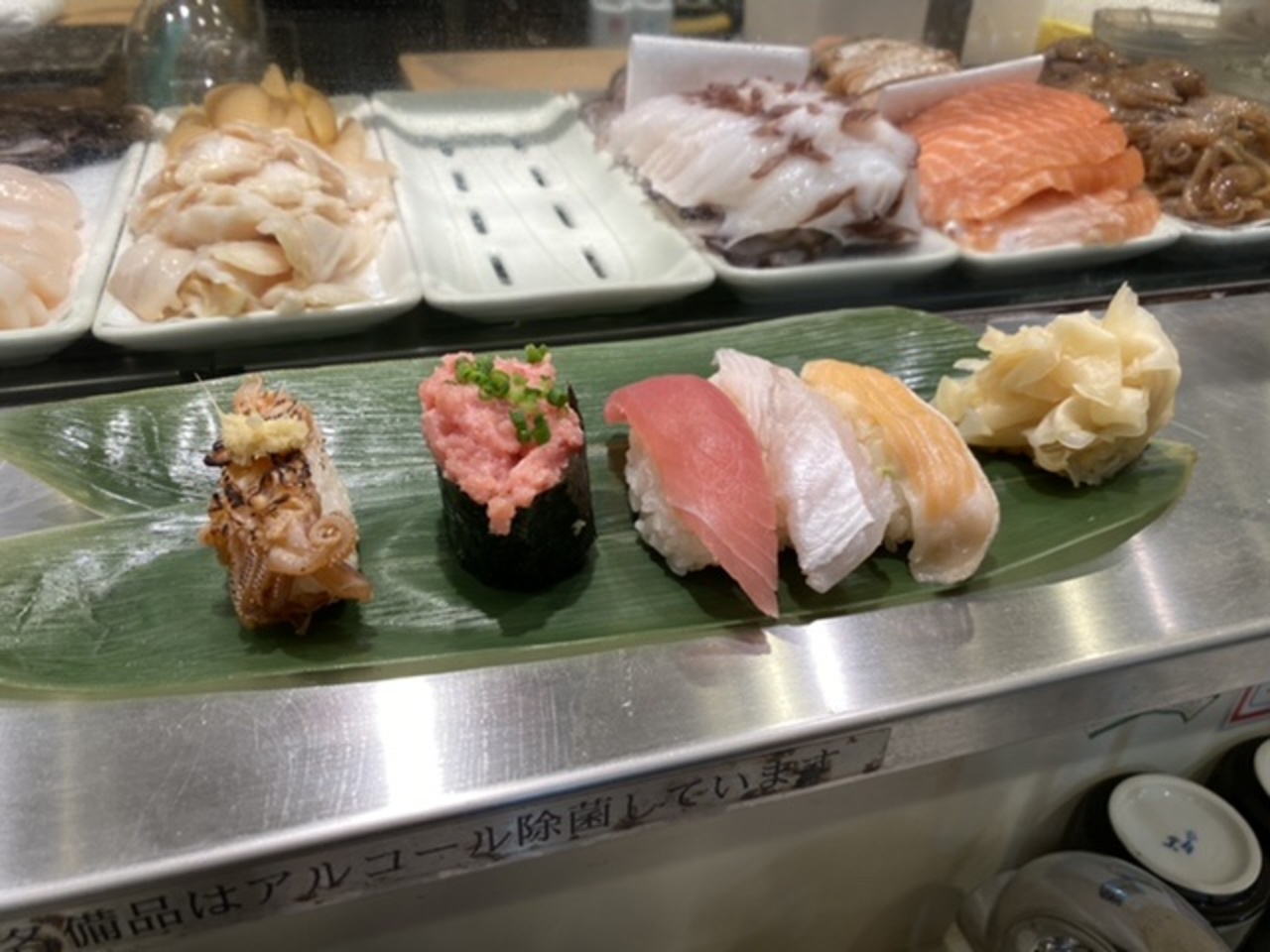 食べたのは5貫セット(マグロ、白身、トロサーモン、焼きげそ、ネギトロ軍艦)にマグロ2貫、ビンチョウ2貫!全部で990円でした。- 旅行時期