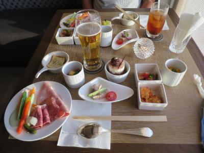 ひとふろ浴びた後、夕方からのラウンジのハッピータイムでは、生ビールとカナッペ(オードブル)を頂きながらサンセットを楽しみました。