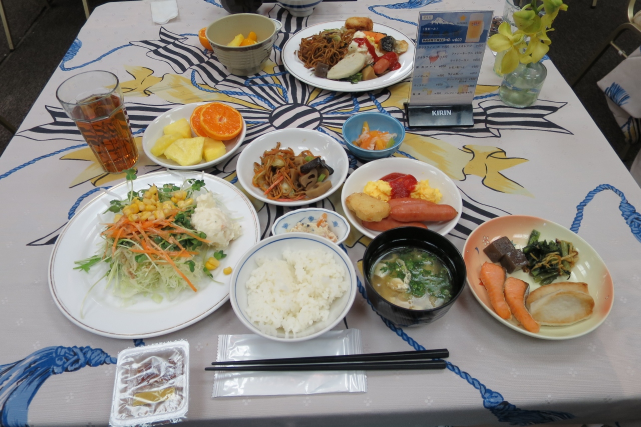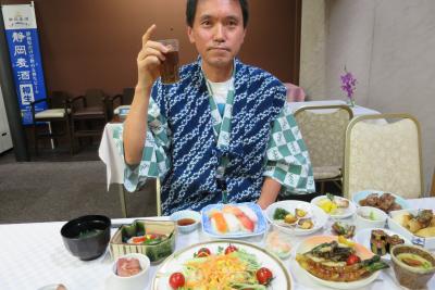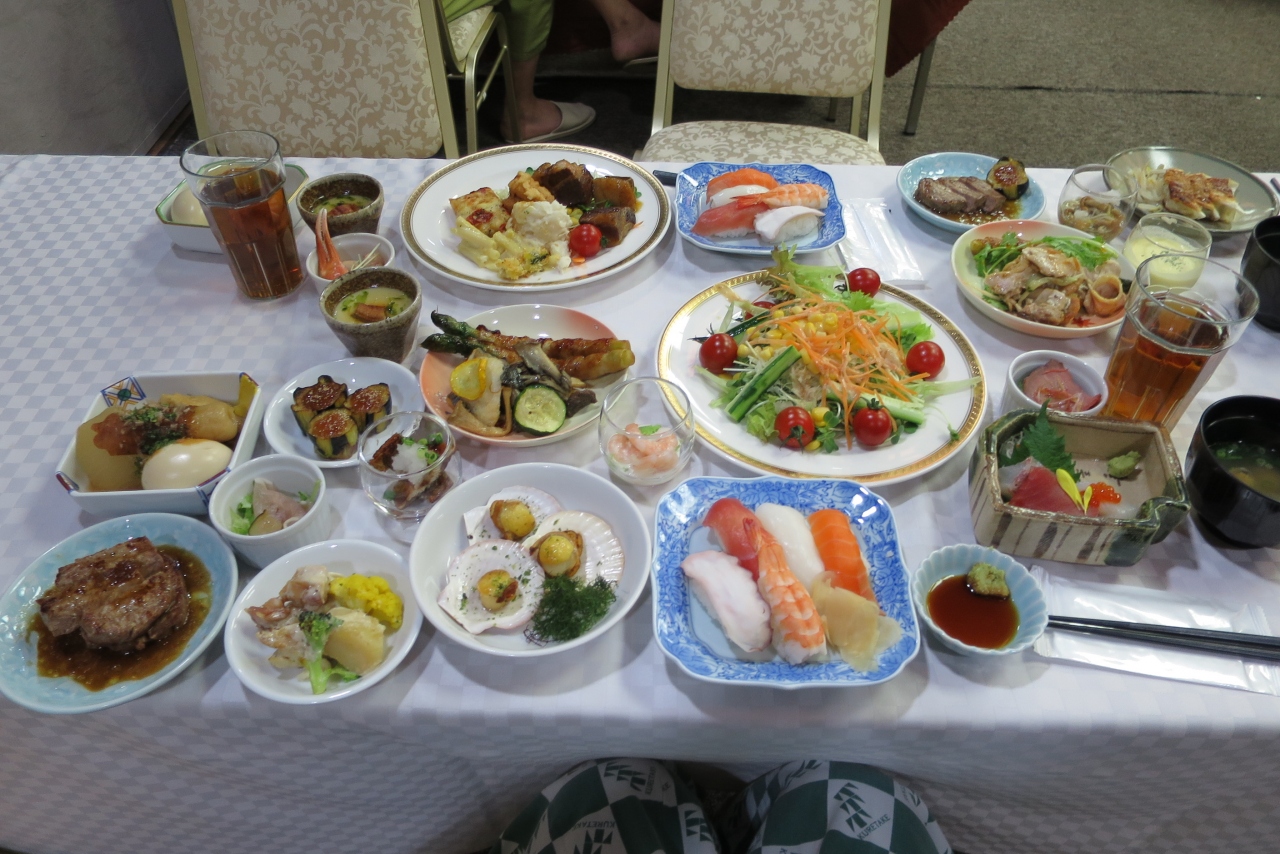 食事は、夕食と朝食がバイキングでした。和洋中のたくさんの料理が食べ放題です。模擬店の寿司、ステーキ、浜松餃子、ラーメンを目の前で作ってくれます!