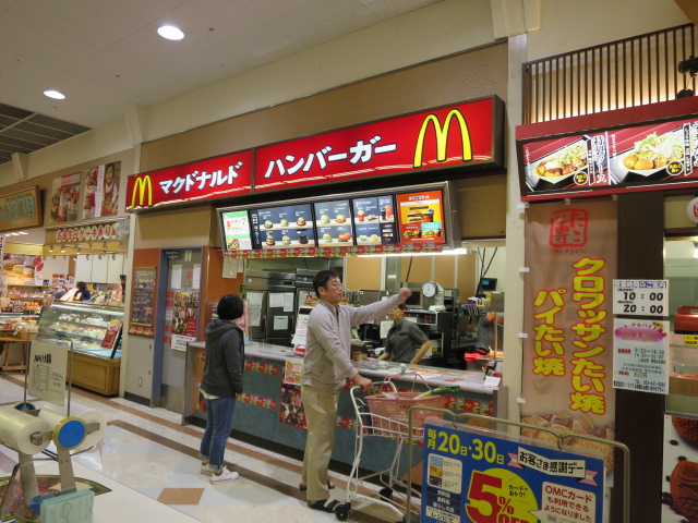 マックスバリュー豊田町店内にマクドナルドがあります。ショッピングセンターの駐車場に車を止めて店内へ入り右手、スーパーのレジのすぐ前にあります。