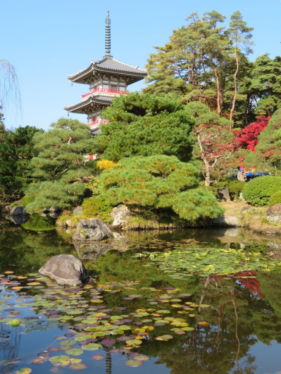 私が訪れた日はちょうど紅葉真っ盛りの晴れた日で、池の周りに配された三重塔や木々の姿が水面に映る景色がきれい。