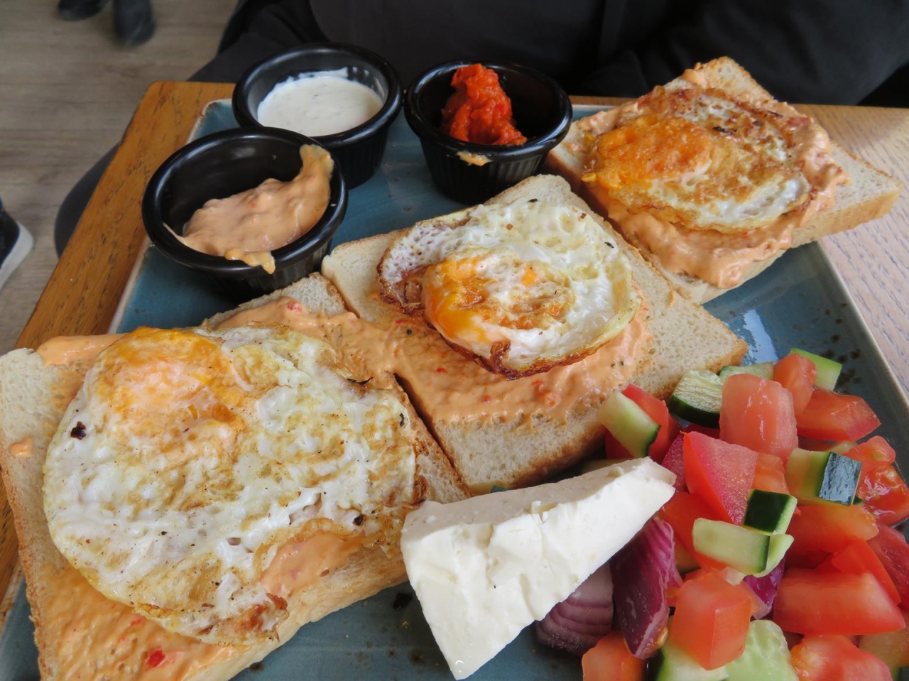 3枚のトーストの上にそれぞれ目玉焼きが乗っていて壮観。