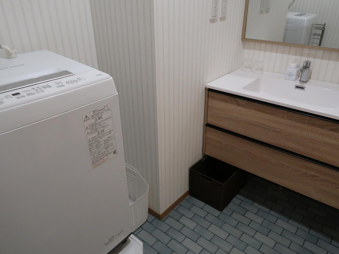 - 洗面所には洗濯機あり。浴室内も広めで浴槽の外でも体が洗えます。