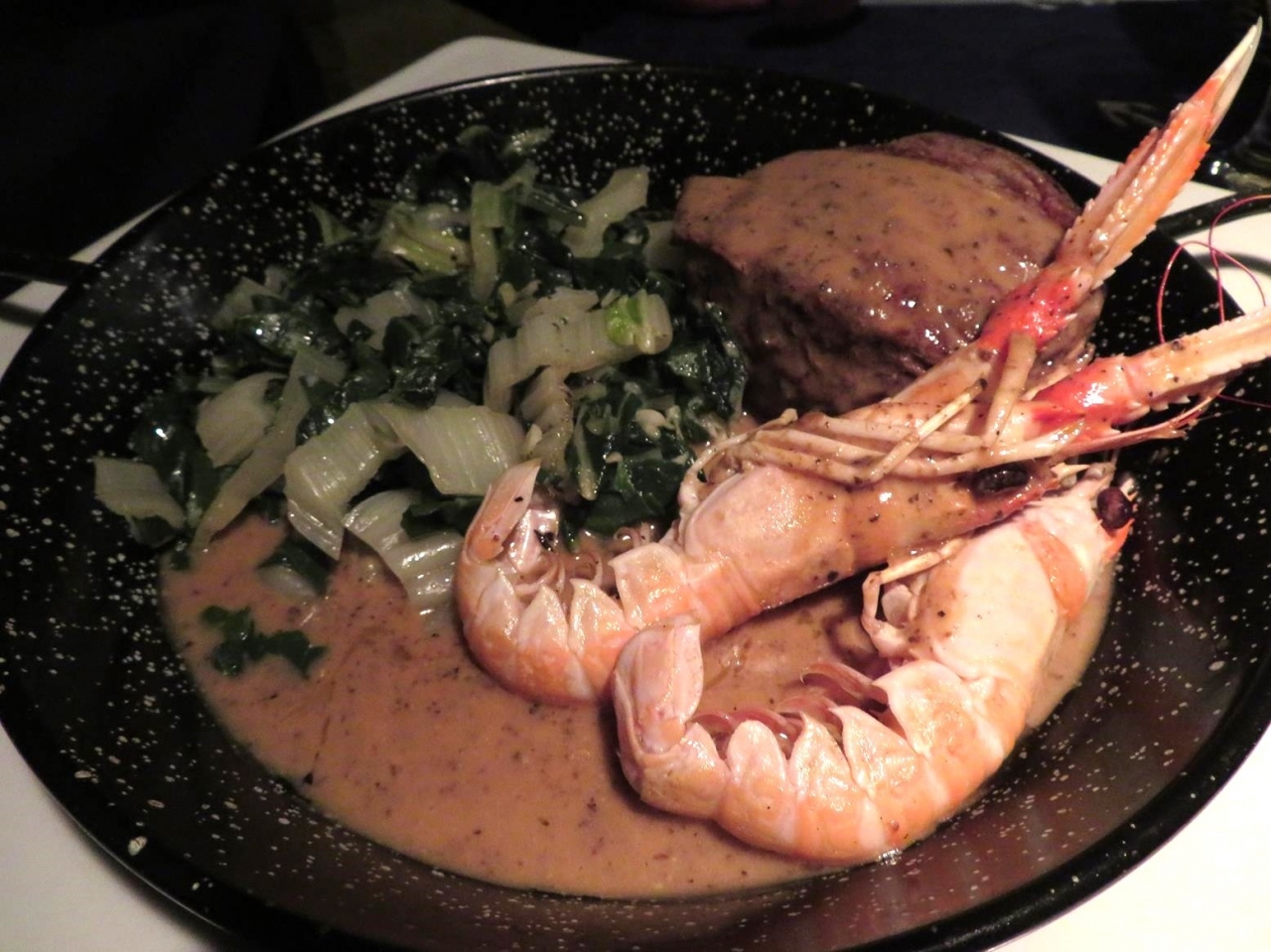 私たちは、地中海風サラダに、黒トリュフ入りクリームソースの手作りパスタと、手長エビ&ステーキが一皿盛りになったサーフ&ターフを選んで待つことしばし。
